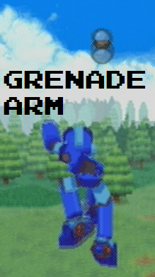 The Grenade Arm allows Megaman to toss a single Grenade straight ahead of him. The range can be augmented by using Free Look to rear back a little. The grenades themselves explode after a couple of seconds, and they also explode on enemy contact. The grenades also bounce off of walls, as well as the ground.