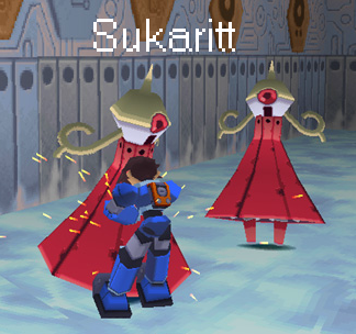 Sukaritt's appearance is pretty feminine, looking a lot like a woman in a pink dress (complete with somewhat of a mock hairstyle). It tends to "skate" around whatever room it may be in, generally minding it's own business. However, once it detects zenny dropped from another reaver in the area, it makes a rather distinct cry and dashes towards it, hopefully grabbing all of the loot before you can.
